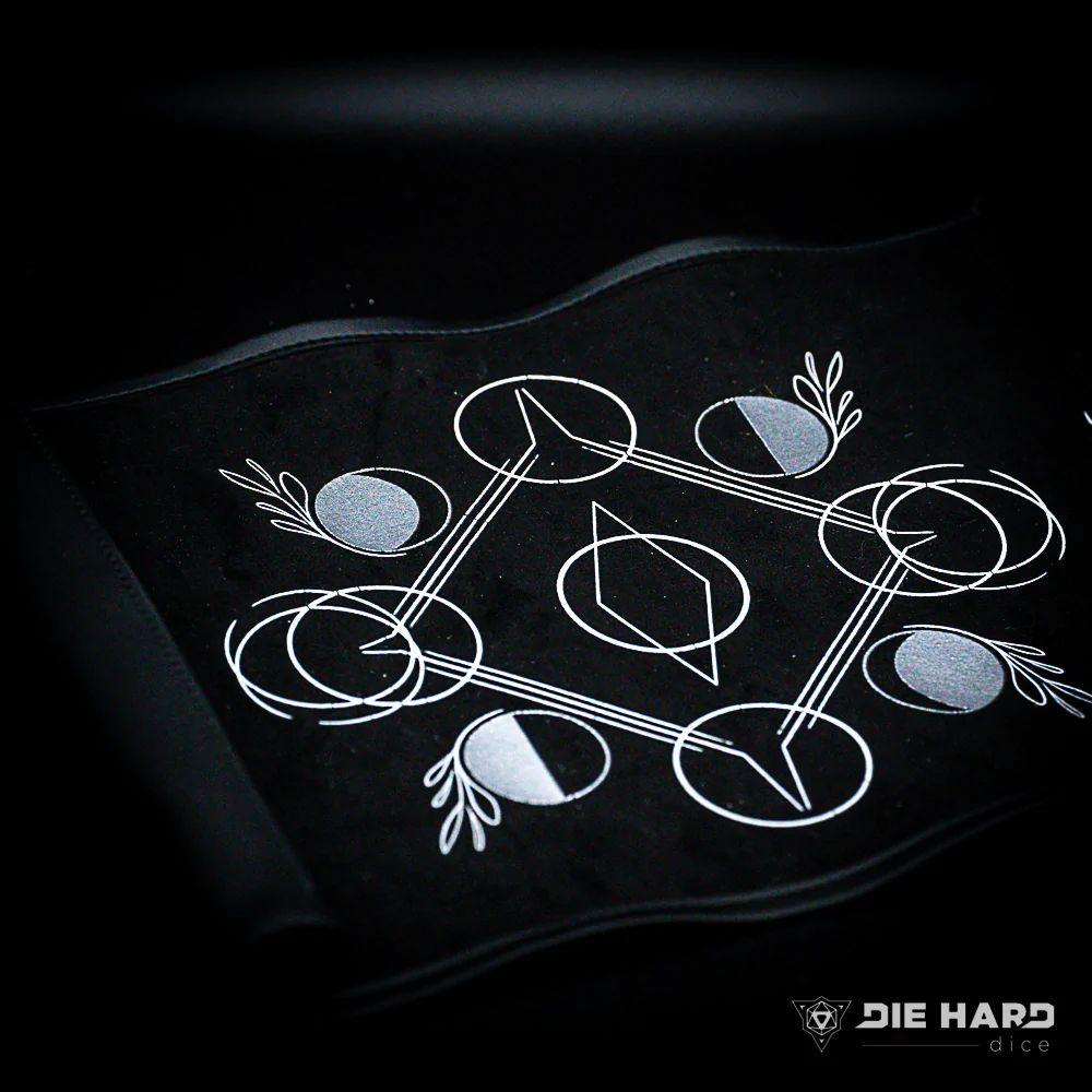 Scroll of Rolling – Lunar Path, a portable hybrid of a rolling tray and dice storage in one snazzy package. The zippered pouch can hold 2 full 7-piece dice sets, and comes with a removable foam to help keep your dice padded and cozy. When not in use, the scroll is rolled up and secured with two snaps, ready to await your next adventure!